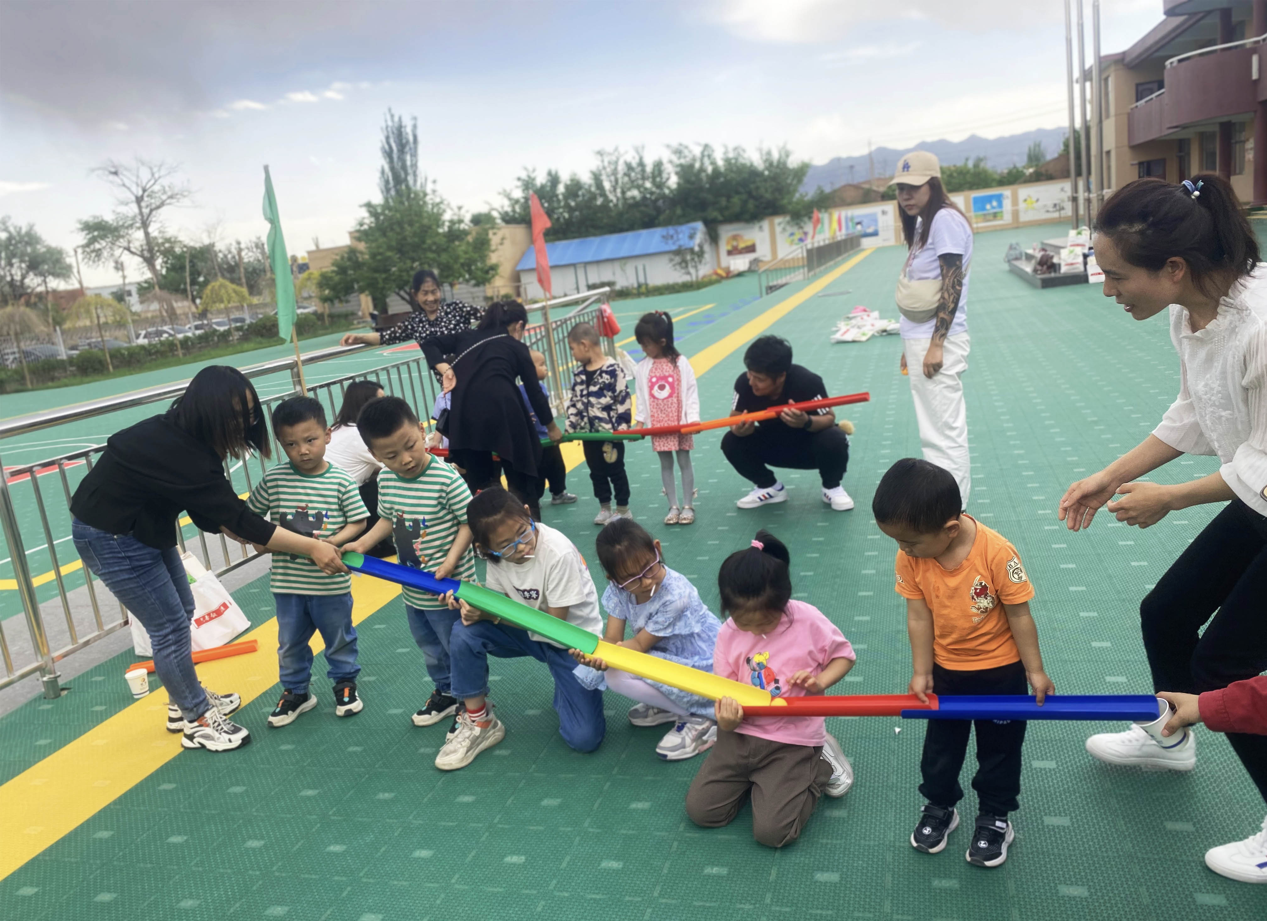 該活動分為小朋友組和家長組。游戲開始時,每個隊員牽拉同心鼓上面綁的繩子,保證鼓面水平,同時裁判將一個排球從鼓面中心上方豎直拋下,隊員齊心協力將球顛起,顛的球越多,為獲勝。 大朋友、小朋友們玩的不亦樂乎。通過三組趣味游戲,讓家長和小朋友們共同協作,完成不同的游戲任務,不僅鍛煉孩子們的團隊配合能力,隨機應變能力,還讓孩子們感受到節日的快樂。